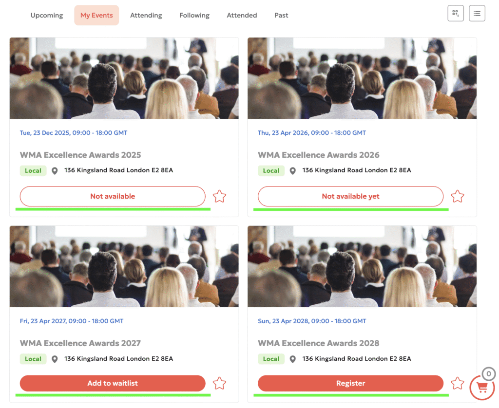 The registration button on event list views now dynamically adapts based on real-time package availability and status.