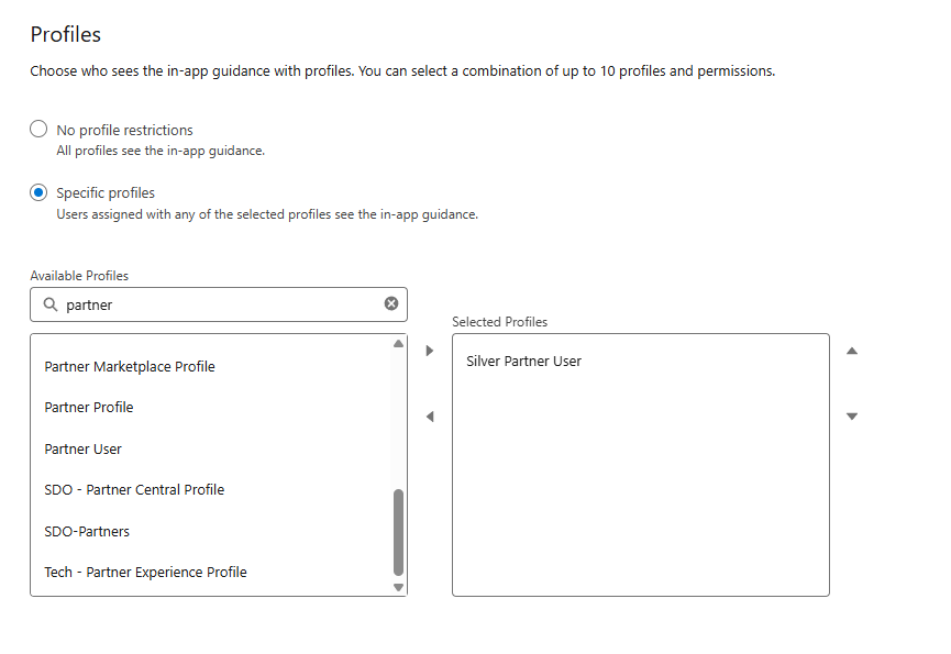 You do not have to show every prompt to every partner. To ensure relevancy, you can filter your audience based on specific criteria. You can target prompts based on standard and custom permissions, specific Profiles, or even standard and custom user fields. For example, you could show a “Gold Tier” onboarding tour only to partners who have the “Gold Partner” profile or permission set.