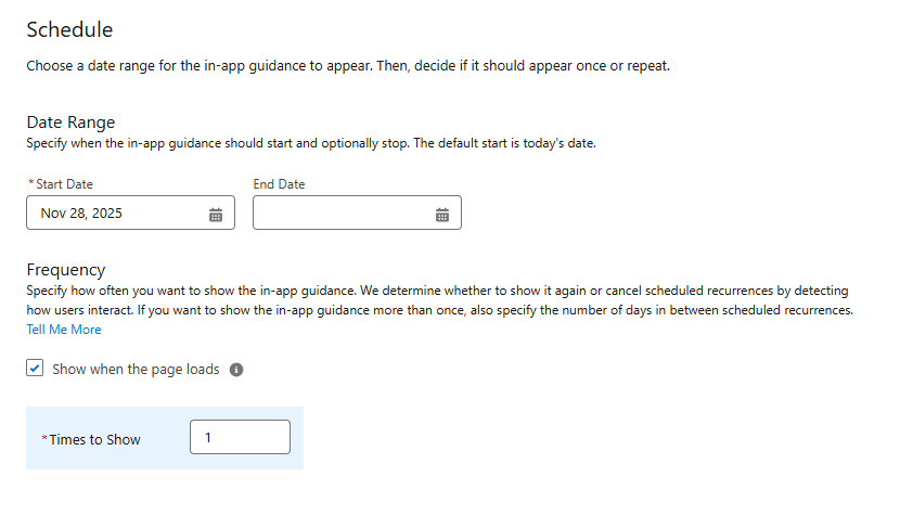 To avoid overwhelming your partners with too many pop-ups, you have full control over the schedule. You can set specific Start and End Dates for time-sensitive announcements. Additionally, you can manage Frequency, determining how many times a prompt is shown to a user and the number of days to wait between displays, ensuring the guidance is helpful rather than annoying.