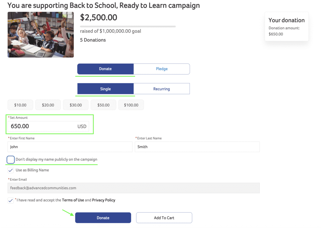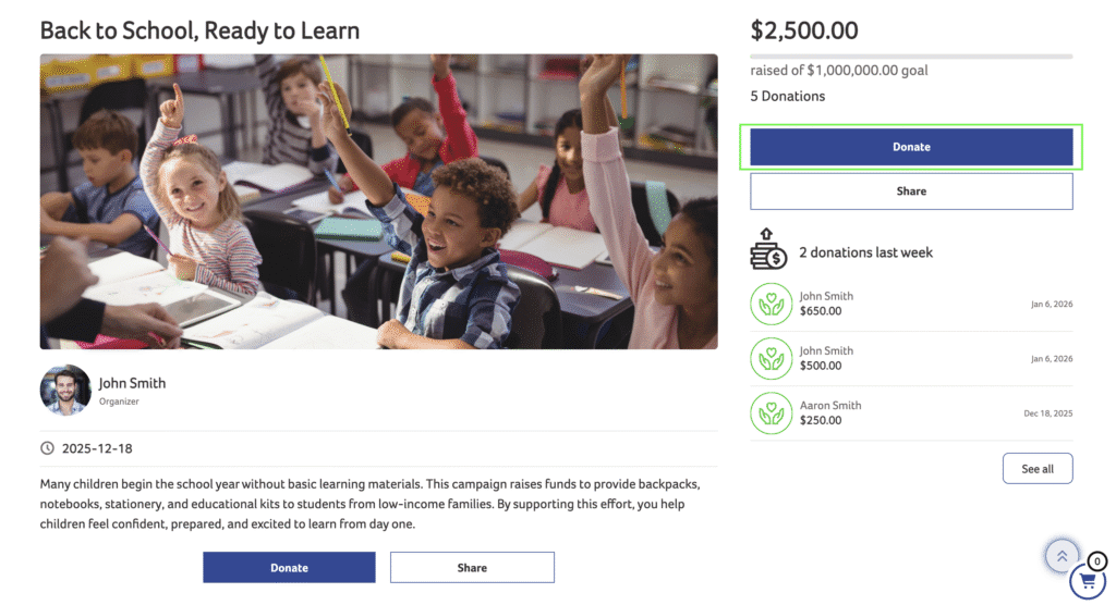 Next, let’s look at how easy it is to make a donation. Open any fundraising campaign you’d like to support, which brings you to the campaign’s detail page. From there, click the Donate button.