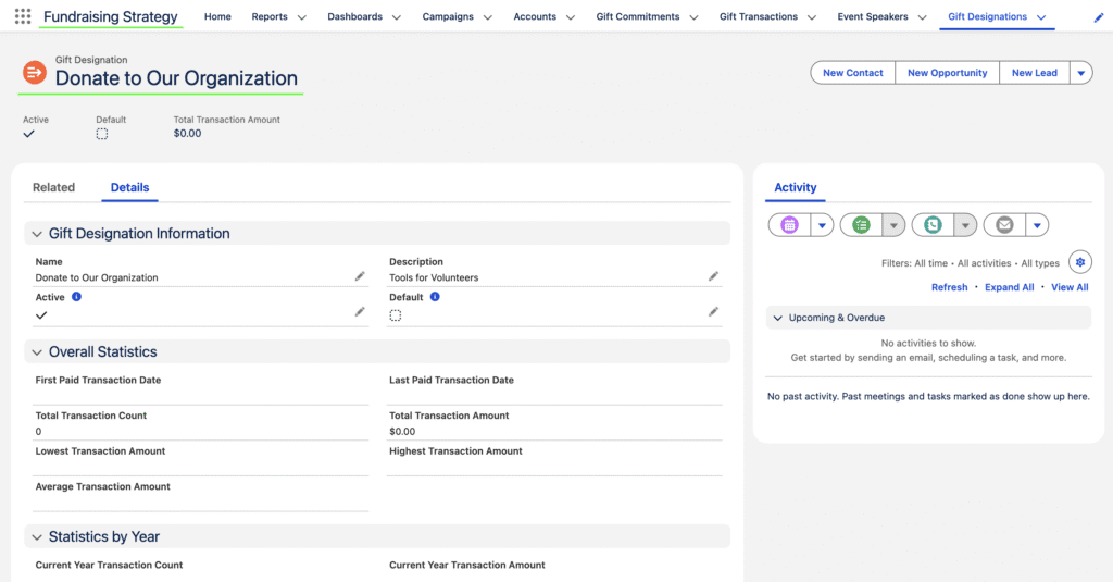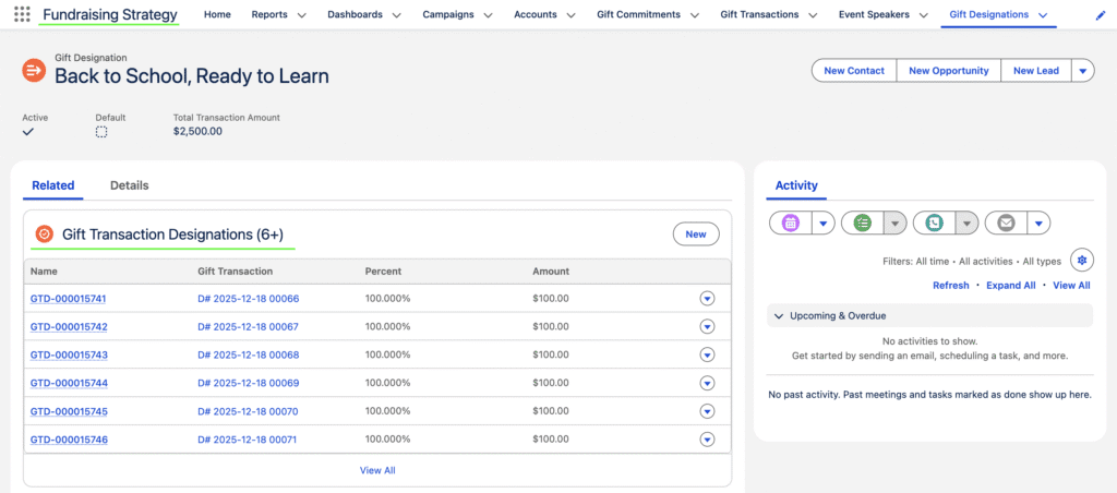 Next, switch to Salesforce Nonprofit Cloud. In the Gift Designation tab, you’ll see the same campaign listed. This integration allows you to track campaign progress and access additional related data directly within Salesforce.
