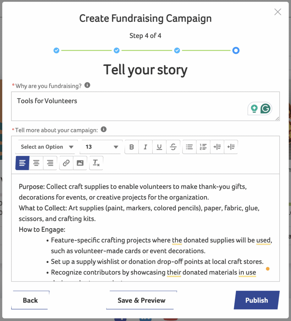 Next, share the story behind the campaign. This is where you explain what you’re fundraising for and why it matters. Clear and compelling storytelling helps donors understand the impact of their contributions and encourages them to get involved.