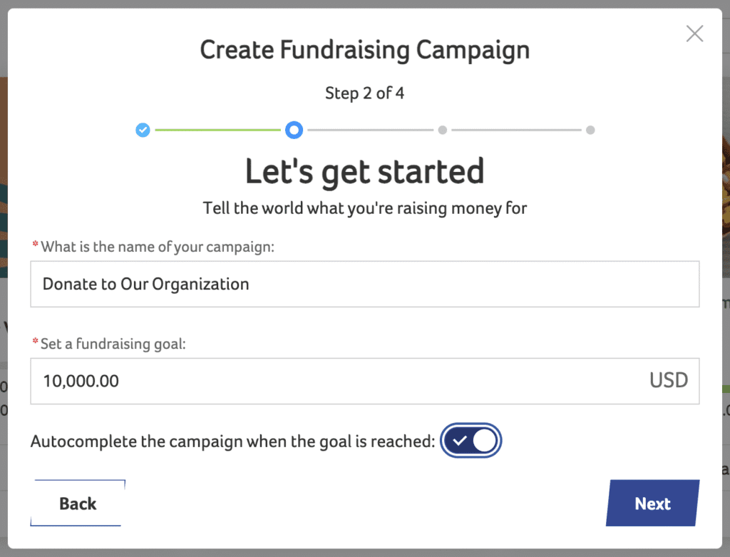 Next, enter the campaign name and set your fundraising goal. This goal represents the total amount you aim to raise through the campaign. You’ll also have the option to decide whether the campaign should automatically be marked as complete once the fundraising goal is reached.