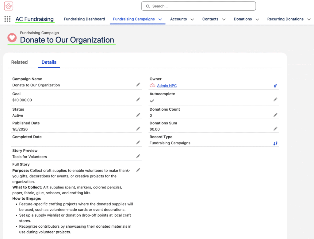 Within the internal environment, the campaign is displayed in the Fundraising Campaigns tab of the AC Fundraising app. From here, you can view all campaign-related information, including campaign details and donations made.