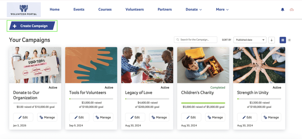 This is the central place where you can view, manage, and create fundraising campaigns.