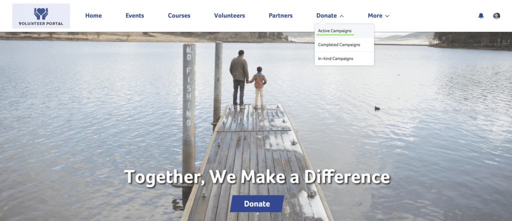 For this example, we’re logged into the portal as a community user. From the portal home page, navigate to the Donate tab and select Active Campaigns.
