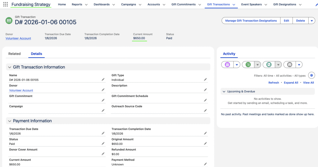 Now let’s see how the donation appears in Salesforce Nonprofit Cloud. By navigating to the Gift Transactions tab, the donation can be found and reviewed immediately, along with all related transaction details.