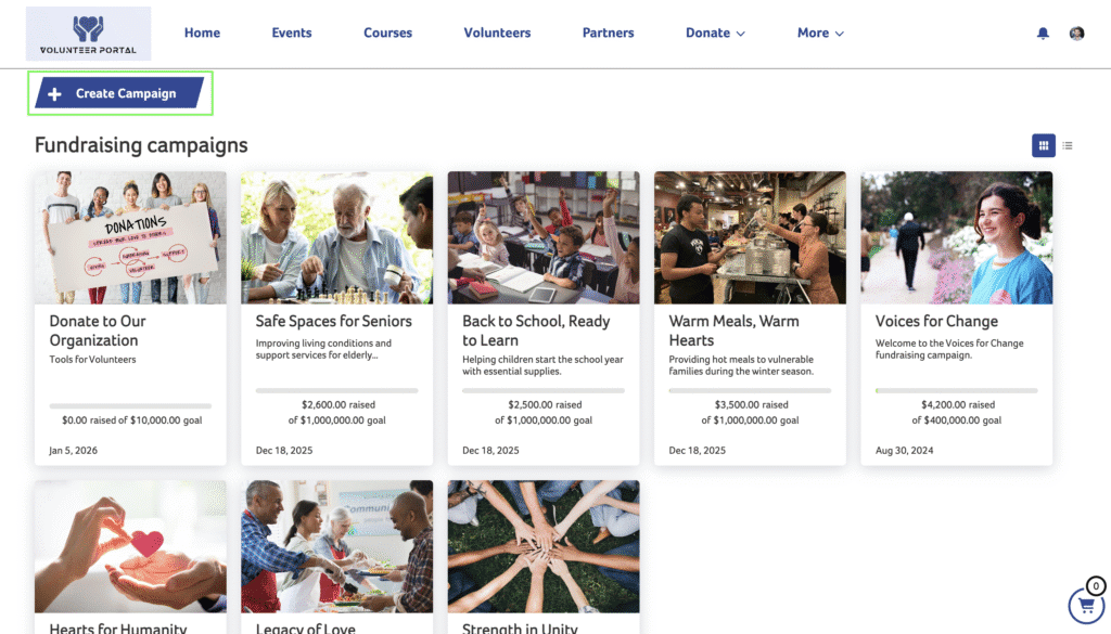 Let’s imagine that our community user John wants to create his own fundraising campaign to raise money for cancer research. To get started, he clicks the Create Campaign button directly on the Active Campaigns page.