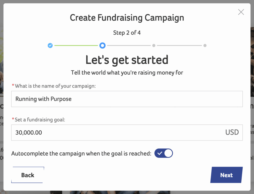 Next, he enters a campaign name and sets a fundraising goal. He also has the option to choose whether the campaign should automatically be completed once the goal is reached.