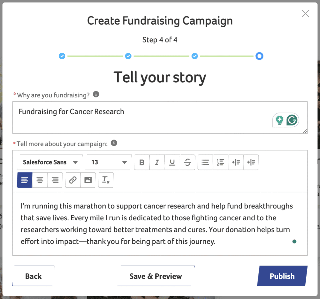 He then tells the story behind the campaign, for example, explaining that he’s running a marathon to raise funds for cancer research. Once everything is ready, John clicks Publish.