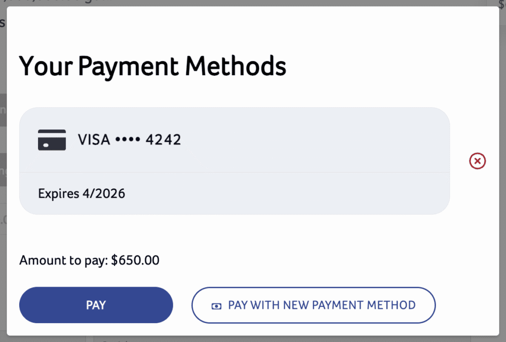 If you are an authenticated user who has made previous transactions, your payment information is automatically pre-populated. Otherwise, you can easily add a new payment method. To complete the process, click Pay.