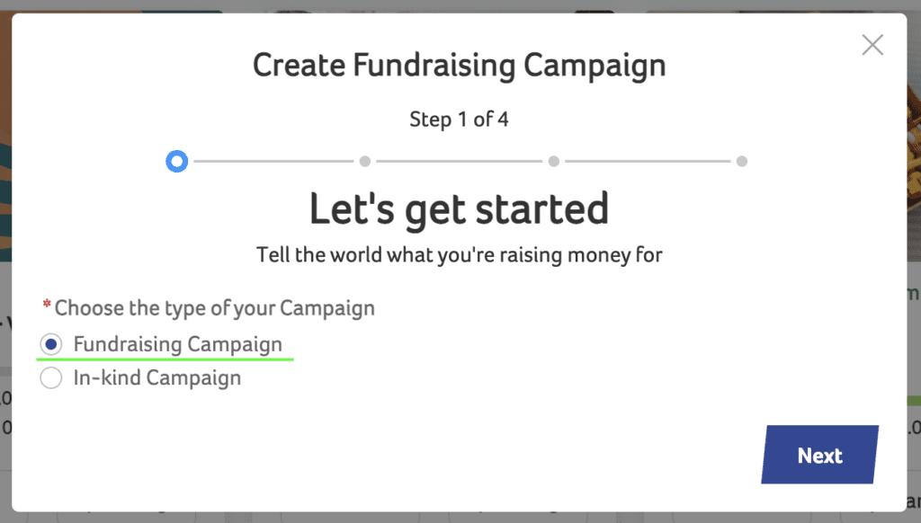 First, John selects the campaign type. You can choose Fundraising or In-kind Campaign. For our purpose, we should choose Fundraising Campaign.