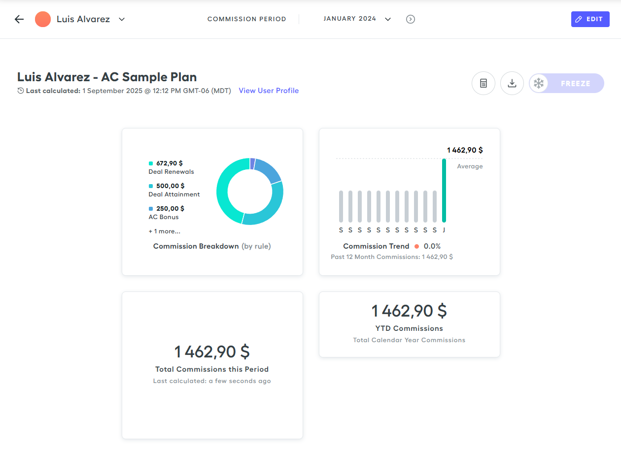- Metric Cards: At-a-glance visuals like Total Commissions, a Commission Trend graph showing performance over the past 12 months, and a Commission Breakdown donut chart illustrating earnings by rule.