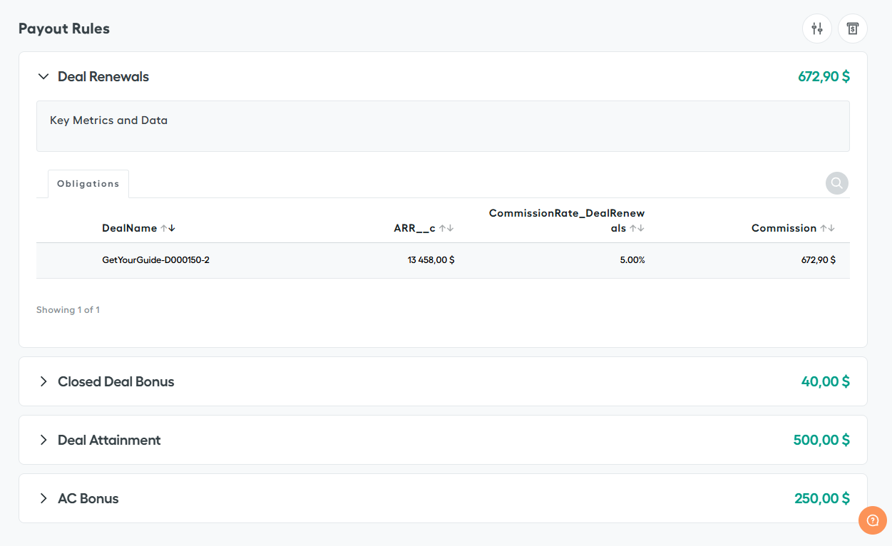 - Customizable Columns: The columns displayed for each rule can be edited to show the most relevant data, such as deal name, ARR, and the specific commission rate applied.