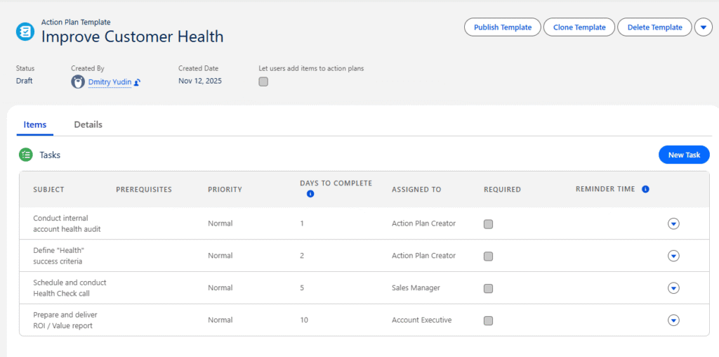 To help users get started immediately, Salesforce provides two default action plan templates that already have these values configured.