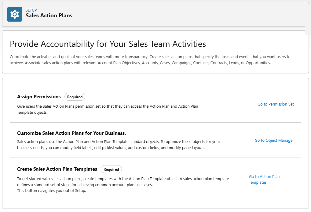 - Assign Permissions: You must give users access to the feature. The simplest way is to assign the “Sales Action Plans default permission set” to all users who need to access sales action plans.