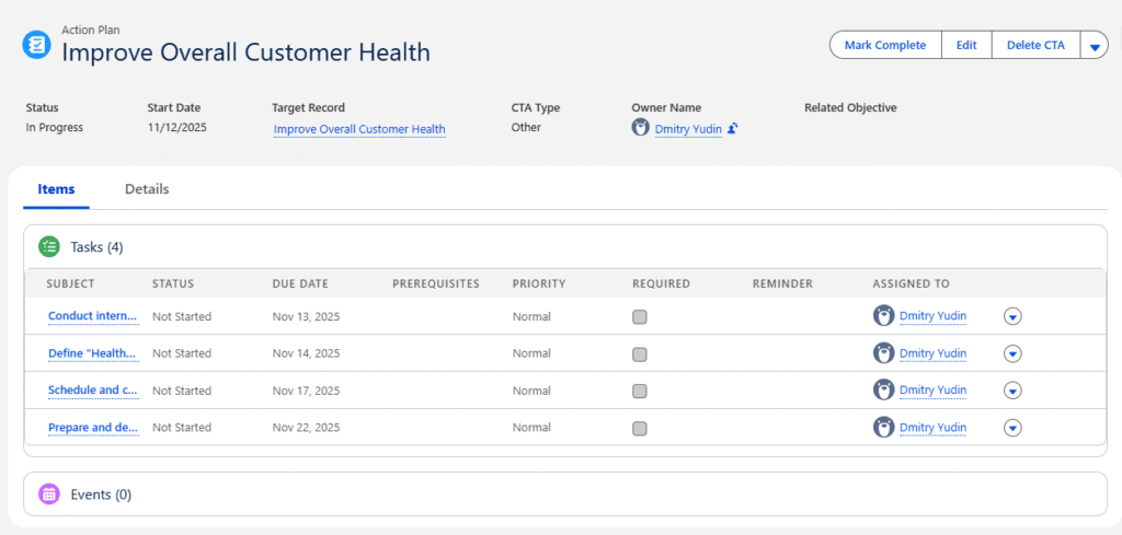 - Tasks and Events: Finally, each Action Plan is made up of the individual “steps”. These are the actual to-do items and meetings your team needs to complete.