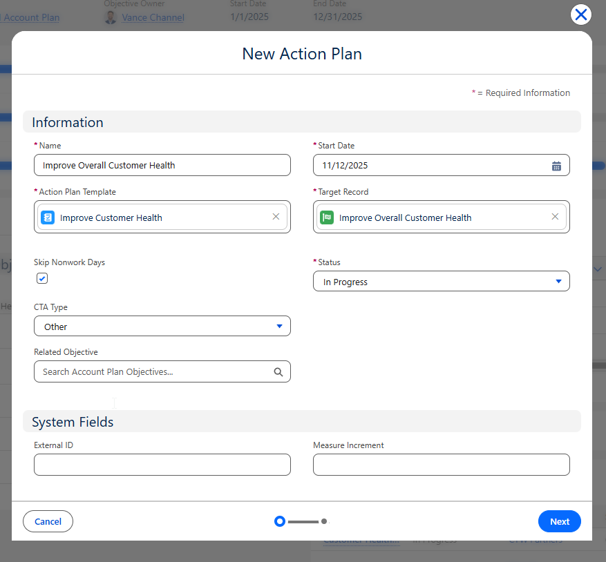 - Next, they must select the required Action Plan Template. This is the predefined set of steps for this type of objective.